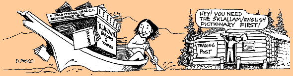 There seems to be a growing interest in Chinook Jargon. The growing list of subscribers to "Tenas Wawa" indicates that there are some serious people out there who speak it or want to learn. We would like to complete this story by settling some common fears of Chinook Jargon students. Contrary to results of an extensive and expensive Chinook Jargon research program going on north of our border, there are not "approximately one-thousand words" in Chinook Jargon. Rather, there are approximately three-hundred and thirty, and many of these are English. Also, many of the words are trade-specific. For example, many Chinook Jargon words of French origin deal with farming. Any speaker with a vocabulary of fifty Chinook Jargon words, excluding the English from that list, can converse with any other speaker. The average number of different Chinook words per issue of Tenas Wawa is probably about fifty. DUANE PASCO