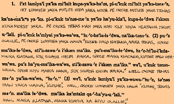 The preceding is an excerpt from a series of tales narrated in Chinook Jargon and recorded by Melville Jacobs in 1930. They were published under the Department of Anthropology at the University of Washington in 1932. The work contains twelve stories, the narration having been done by five natives from various tribal and linguistic backgrounds. While the sentence structure of all these narrators is somewhat consistent, pronunciation seems to vary quite a bit. The phonetic system used by Jacobs allows this fact to be readily discernible to the reader.