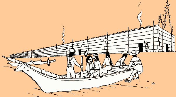 The canoe was now nearly to the beach in front of the great house. John could see that the planked structure was the shed-roof type. It stretched along the beach for at least 500 feet, and was about 50 feet wide. |