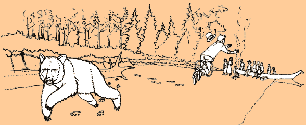 | Charlie: | "Spose maika coolie hyak, klonas maika iskum okoke chetwoot!" | "If you run fast, maybe you catch that black bear!" | |